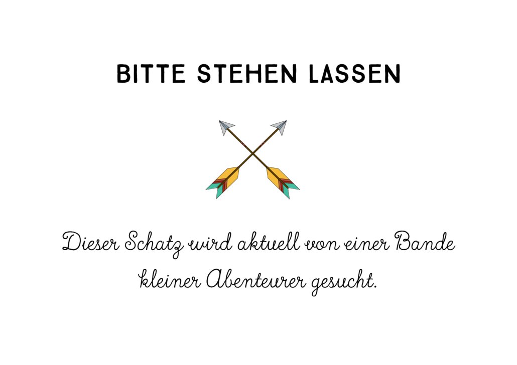 - Der Schatz: Am Ziel angekommen gibt es die letzte und für die Kinder wichtigste Aufgabe – die Schatzsuche. Los geht’s für Euch mit dem Verstecken des Schatzes. Wenn Ihr einen öffentlichen Platz wählt, ist es sinnvoll, dass einer von Euch während der Schnitzeljagd mal kurz abbiegt um den Schatz zu verstecken. So ist die Wahrscheinlichkeit, dass der Schatz vor Eurem Eintreffen verschwindet, schon einmal ein bisschen minimiert. Wenn Ihr den Schatz bereits vor der Schnitzeljagd deponieren wollt, könnt Ihr auch einfach einen Zettel befestigen auf dem steht, dass der Schatz aktuell von einer Bande wilder Abenteurer gesucht wird, und man ihn bitte stehen lassen soll. Wir haben Euch hier auch einen Zettel zum Ausdrucken vorbereitet. Einfach ausdrucken und auf den Schatz pinnen. Gute Verstecke für Eure Schatzkiste sind: an einem Baum aufhängen, unter Ästen und Laub oder im Gebüsch verstecken. Es ist übrigens auch eine gute Option die Schatzsuche Zuhause enden zu lassen, so habt Ihr die Rasselbande direkt daheim und umgeht auch die vorhin erwähnte Problematik betreffend des Verschwinden des Schatzes. Als Schatz eignen sich bestens die von Euch vorbereiteten Mitgebselbeutel. Der große Vorteil ist: Jedes Kind hat ein fertiges Paket und alles ist bereits gerecht aufgeteilt. Gebt den Kindern dann ruhig ein bisschen Zeit, um nachzusehen was alles in Ihrem Schatzbeutel ist.
