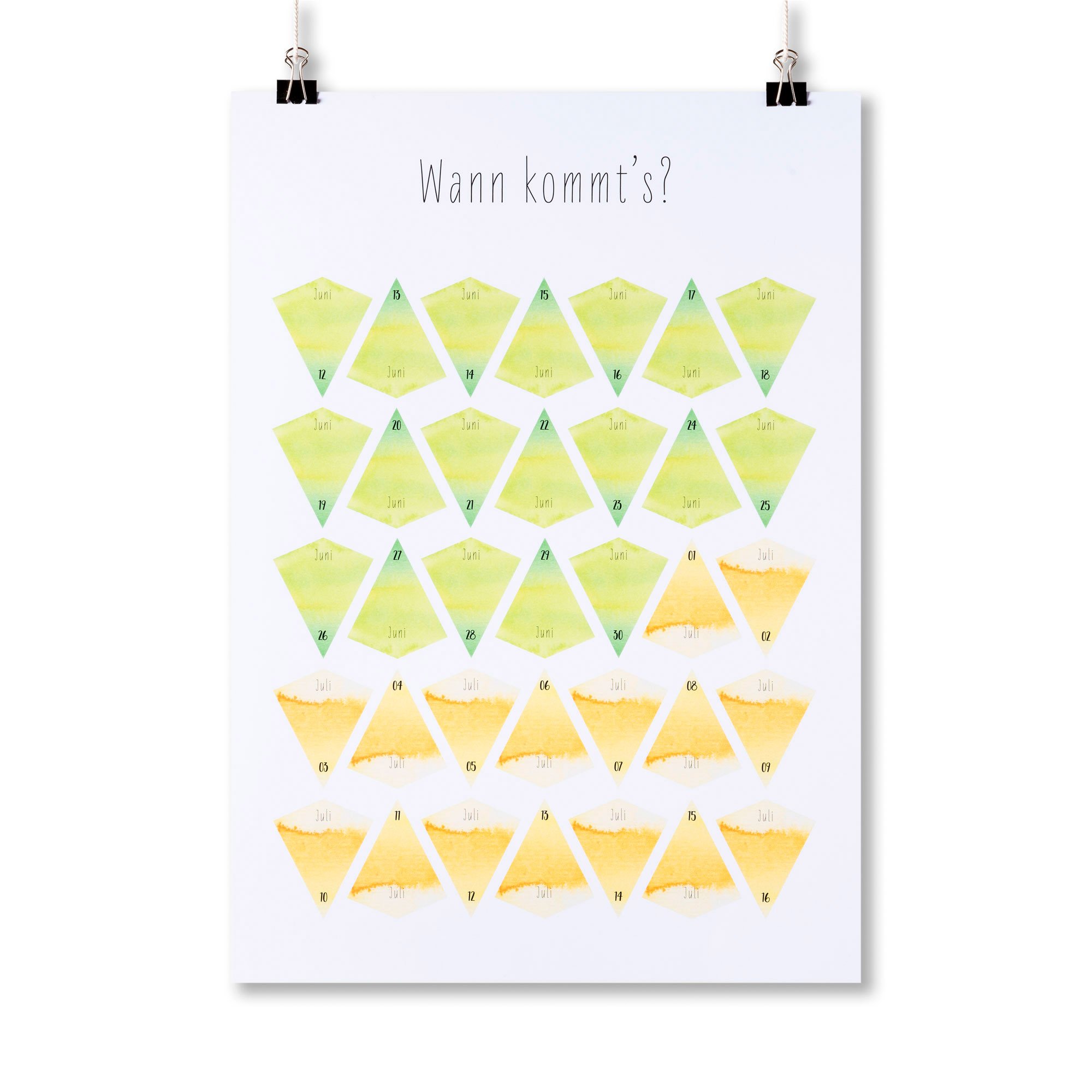 Unser Diamond Poster ist ein Kalenderblatt, auf dem Eure Gäste Tipps abgeben können, wann das Baby auf die Welt kommt. Gebt bei der Bestellung einfach Euren errechneten Geburtstermin an und wir gestalten das passende Poster.